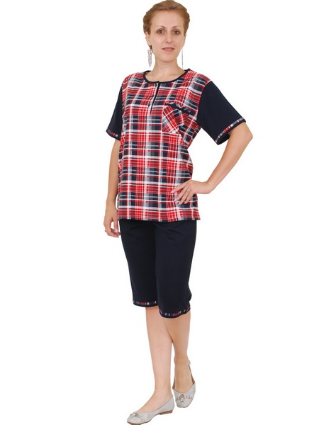 Описание: Свободная блуза из набивной кулирки, планка с застежкой на 3 пуговицы, карман, короткие рукава, разрезы. Брюки 3/4 из однотонной кулирки.