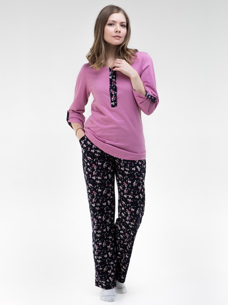 Описание: Комплект из однотонной и набивной кулирки. Свободная блуза, планка с застежкой на пуговицы, рукав 7/8 со шлевкой. Брюки длинные с внутренними карманами.