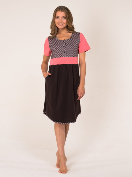 Описание: Туника комбинированная из набивной и однотонной кулирки. Круглый вырез горловины, внутренние карманы и низ изделия окантованы бейкой из набивного полотна.