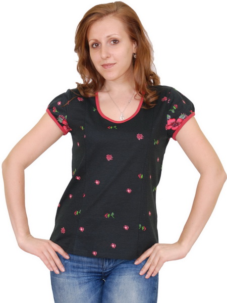 Описание: Блузка комбинированная из набивной и однотонной кулирки. Рельефы, сборка по горловине, короткий рукав - реглан.