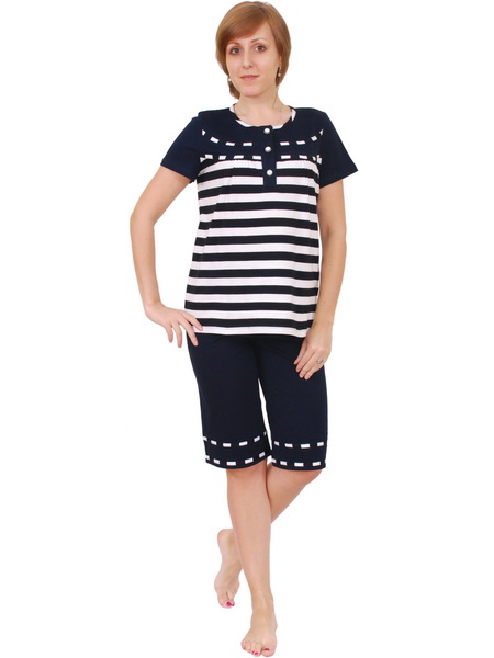 Описание: Комплект из набивной кулирки и серого меланжа. Отрезная кокетка с декоративной бейкой, планка с застежкой на три пуговицы, по груди сборка. Бриджи длиной 3/4 с декоративной бейкой по-низу.