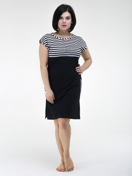 Описание: Платье из однотонной кулирки с кокеткой из набивной кулирки. Вырез горловина лодочка, спущенный рукав, карманы - листочки.
