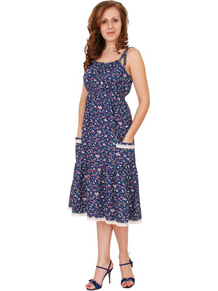 Описание: Платье-сарафан из набивной кулирки на завязывающихся бретелях. По накладным карманам и оборке кружево, лиф с резинкой.