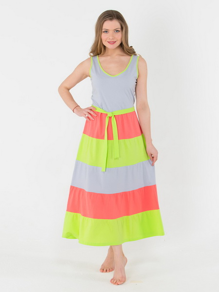 Описание: Платье - сарафан из однотонной кулирки, длинный. V-образный вырез горловины, ярусы со сборкой, пояс.