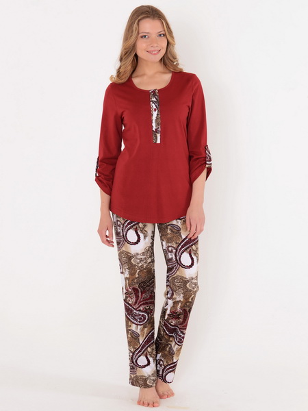 Описание: Комплект из однотонной и набивной кулирки. Свободная блуза, планка с застежкой на пуговицы, рукав 7/8 со шлевкой. Брюки длинные с внутренними карманами.