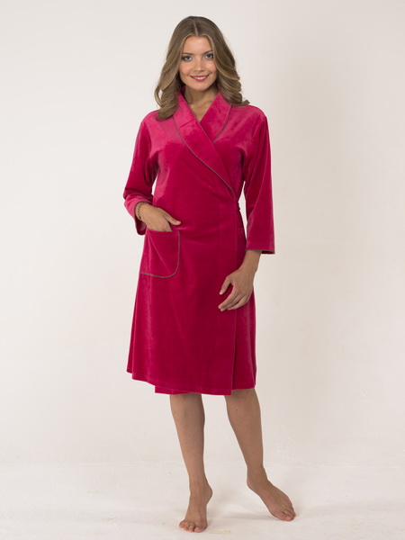 Описание: Халат из однотонного велюра, длиной до колен на запах. Воротник шаль, накладные карманы, рукав 7/8.