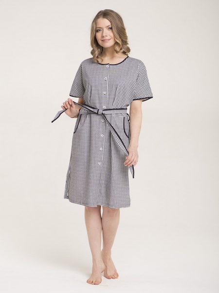 Описание: Платье-халат из кулирки в клетку с цельнокроеным рукавом, два внутренних кармана, вырез горловины и пояс обработаны тонкой бейкой.