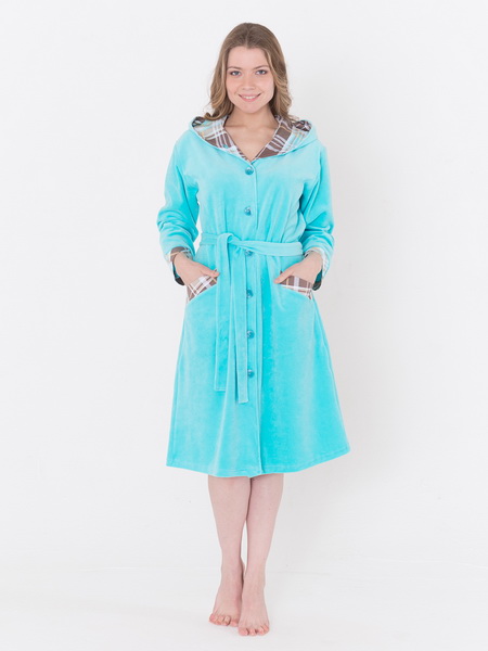 Описание: Халат из велюра с капюшоном и поясом, длиной до колен.
